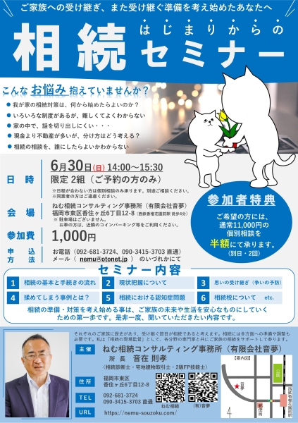 相続セミナーを、6/30(日)に弊社事務所にて開催します。時間は14:00~15:30です。参加費は1,000円です。詳細は直リンクをご確認ください。個別相談は随時受付けております。